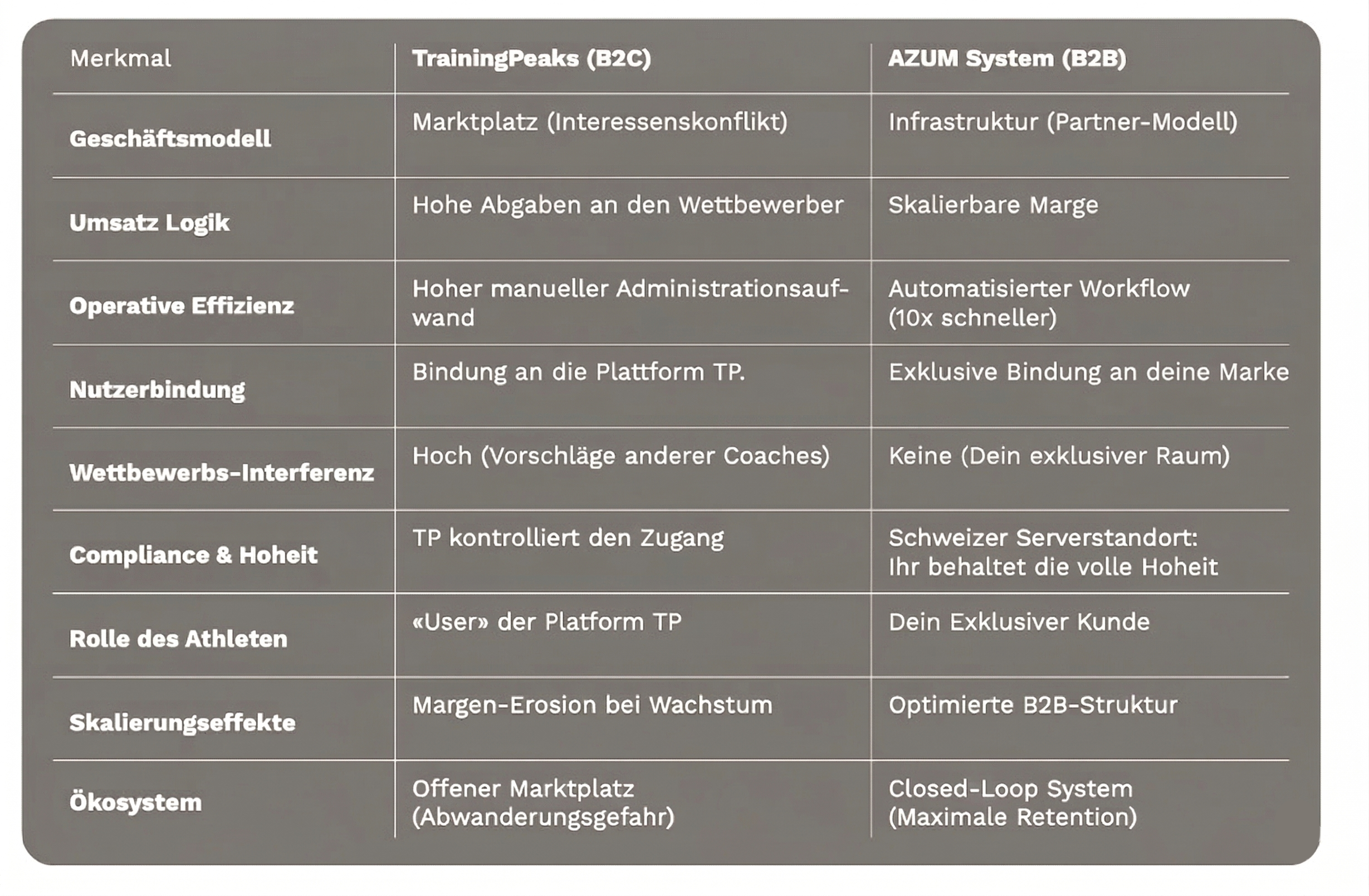 - B2B (AZUM): AZUM agiert als reine Infrastruktur. Wir sind deine Software im Hintergrund und bieten selbst keine Trainingspläne an. Wir liefern ausschließlich das Werkzeug, damit dein Coaching-Business wachsen kann.