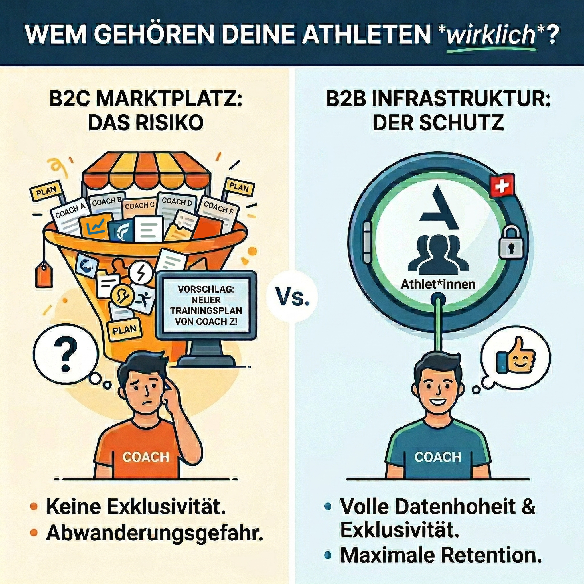 - B2C: Der offene Marktplatz bringt eine ständige Abwanderungsgefahr mit sich. Ein Klick genügt, und der Athlet kauft den Standard-Plan eines anderen Anbieters.