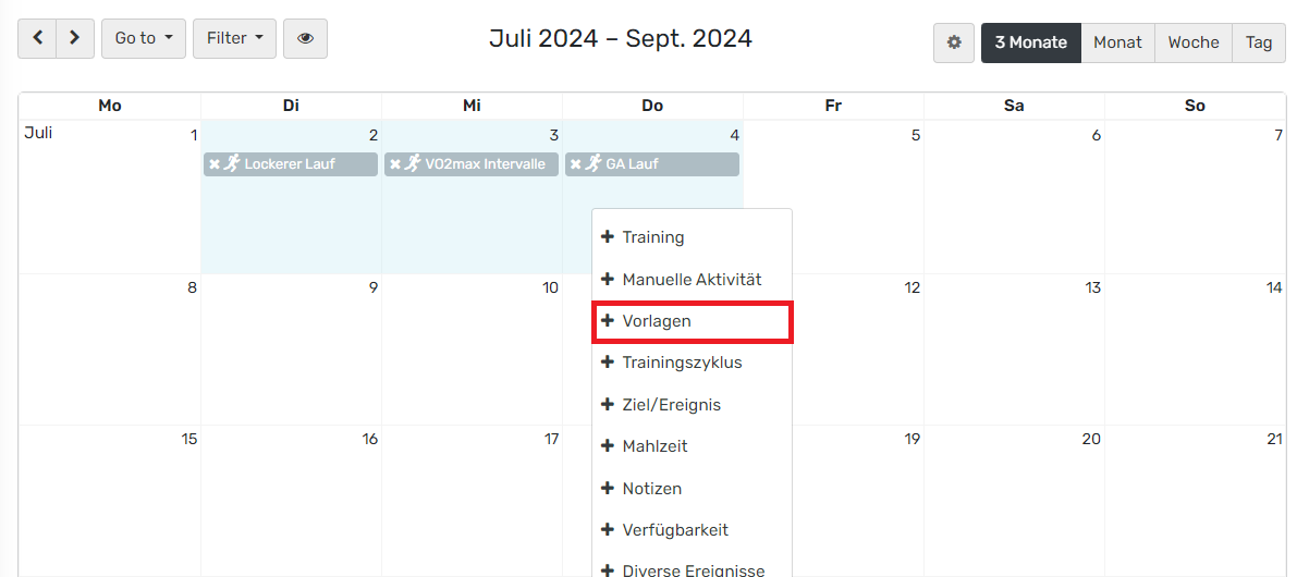 Viele Trainer*innen nutzen in ihrem Coaching oft eine Sequenz von Trainings, um alle gewünschten physiologischen Systeme optimal anzusprechen und so ihre Athlet*innen auf das nächste Level zu heben. Zum Beispiel: Lockeres Training → VO2max-Training → Grundlagenausdauer-Training. Diese Trainings können in der Agenda eingetragen werden und durch Markieren der Tage sowie Klicken auf „+Vorlagen“ als Plan gespeichert werden. Gib dem Plan immer einen sinnvollen Namen, um ihn später leicht wiederzufinden.